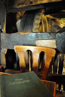 The mill still cranks along, as you can see, although I'm not clear on whether it's just for show or provides some measure of hydroelectric power. In any case, it also provides a nice backdrop for a beer and a snack. Or if the weather is fine, the back terrace offers views of corn and a lot full of cars with Dutch plates.